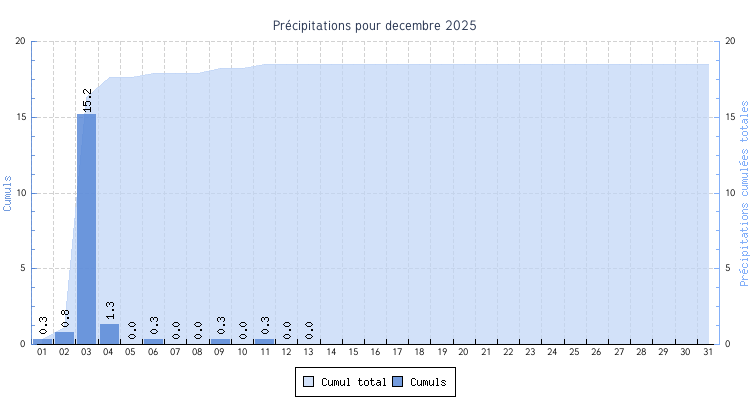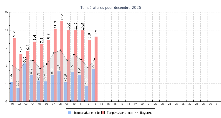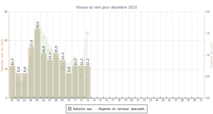 | 13 | 2.2 °C à 08:28 | 9.5 °C à 14:44 | 4.5 °C | 1.6 km/h (11.2 km/h) | 55 |